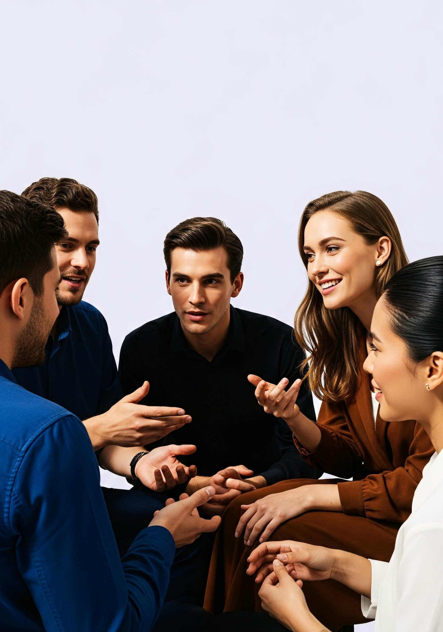 A group of five people in a lively discussion, showcasing teamwork and collaboration in a professional setting.