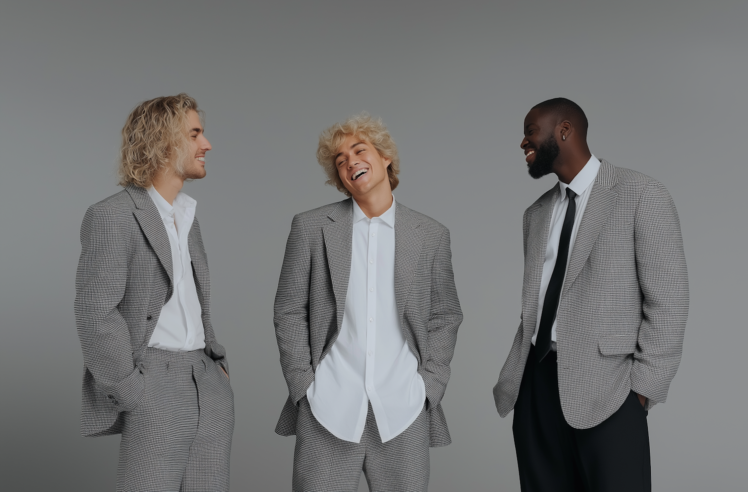 Three stylish individuals in gray checkered suits share a lighthearted moment against a neutral background.