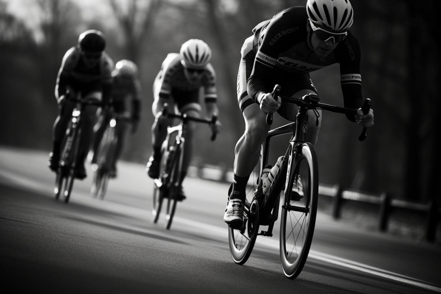 Dynamic black and white photo of cyclists racing, highlighting speed and competition with a focus on the leading rider.