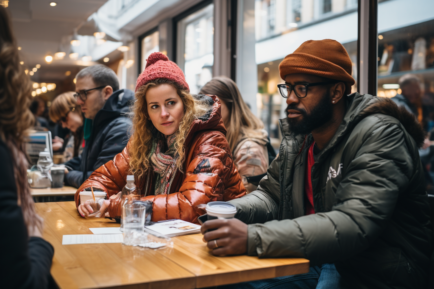 Diverse group enjoying a cozy café, with warm lighting and lively atmosphere. People in winter attire, sipping drinks and chatting.