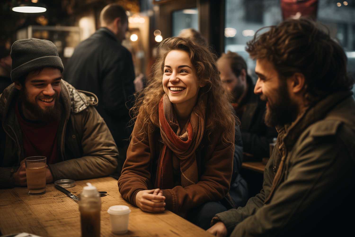 Three friends share a joyful moment in a cozy café, surrounded by warm lighting and laughter.