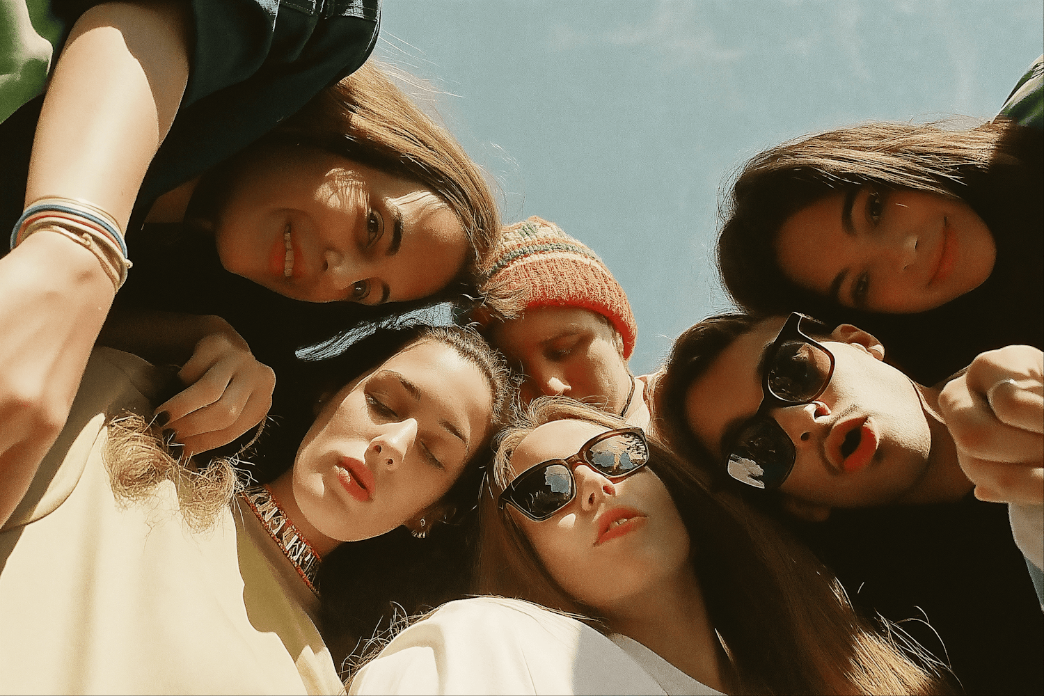 A diverse group of friends joyfully gather, looking down at the camera against a clear blue sky, capturing a moment of camaraderie.