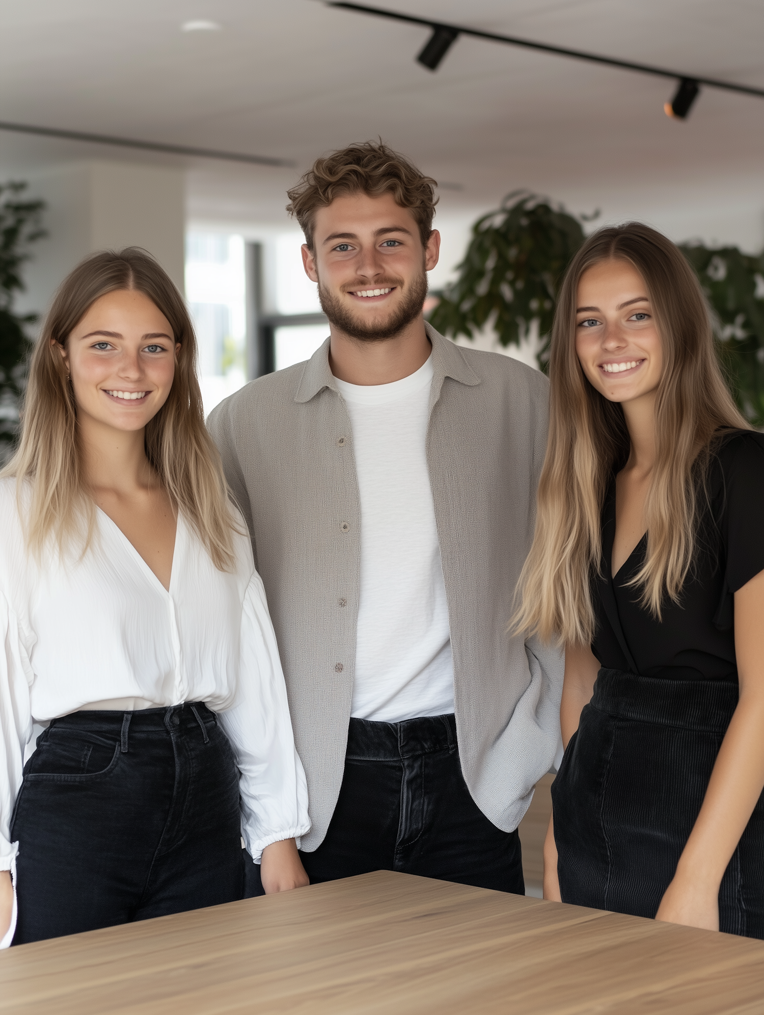 Three young adults smiling indoors, dressed in casual attire, standing in a modern setting with greenery in the background.
