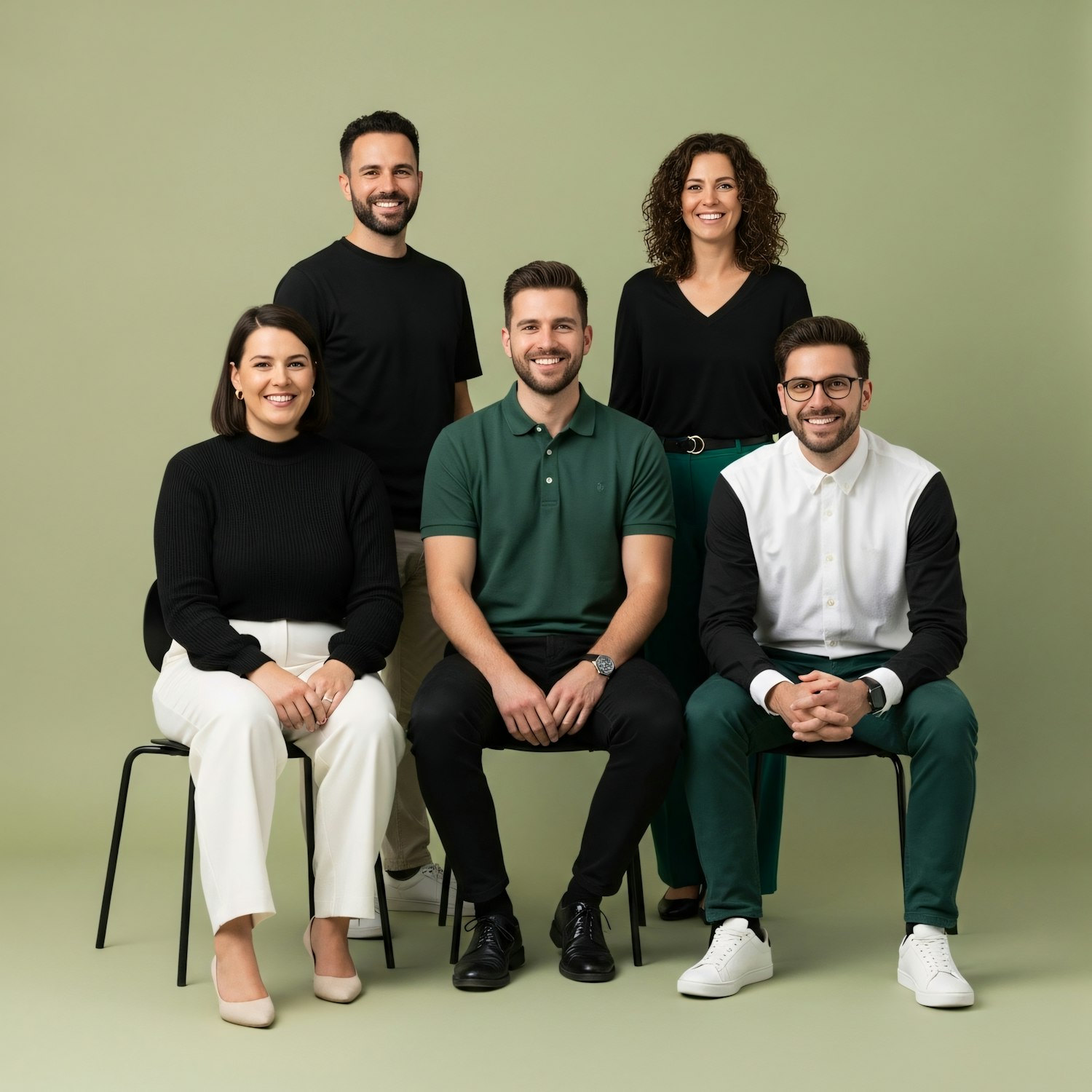 A group of five people in casual professional attire, smiling warmly against a light green background, creating a friendly and approachable vibe.