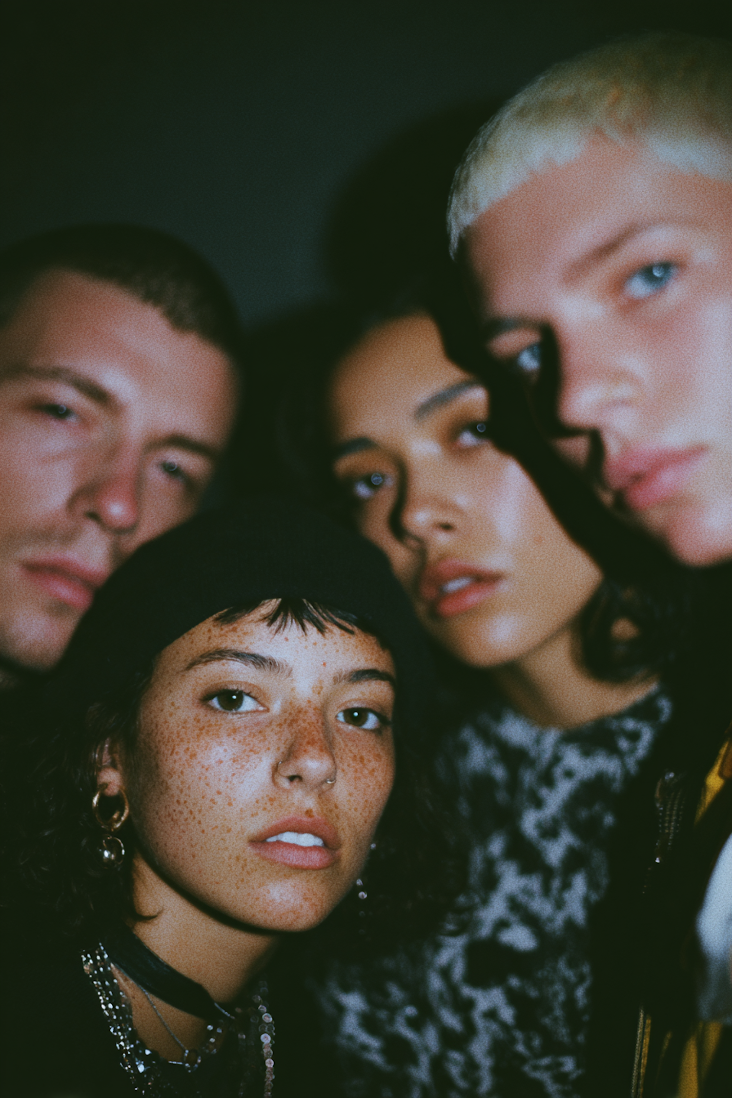 A close-up of four individuals with unique styles and expressions, captured in a dimly lit, moody setting.
