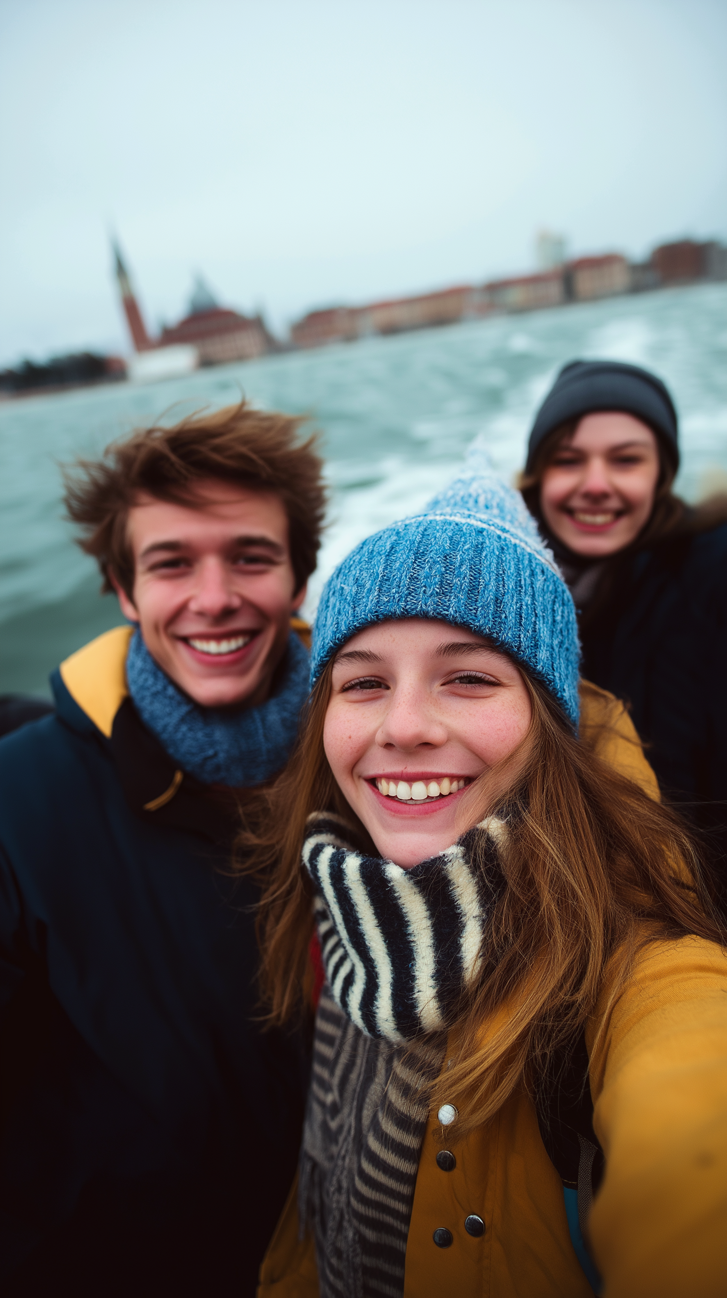 Three friends smiling for a selfie on a boat with a scenic waterfront and historic buildings in the background.