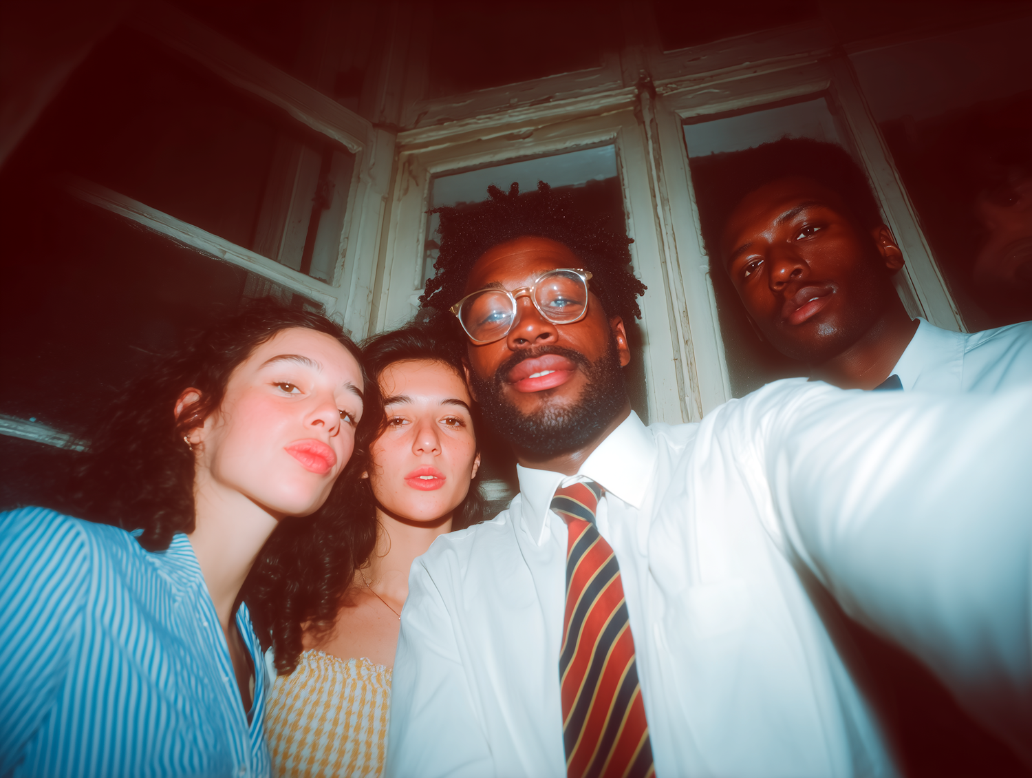 A group selfie of four friends, two women and two men, dressed in casual and semi-formal attire, with a vintage window backdrop.