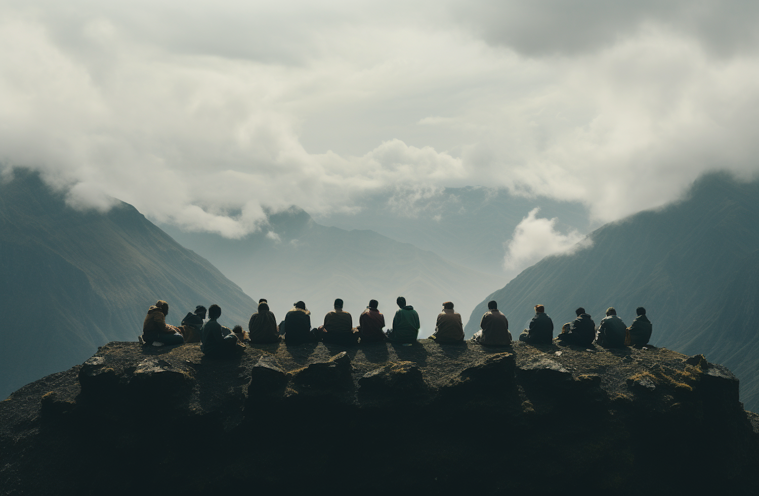 A group of people sit on a cliff edge, overlooking misty mountains under a cloudy sky, creating a serene and contemplative scene.