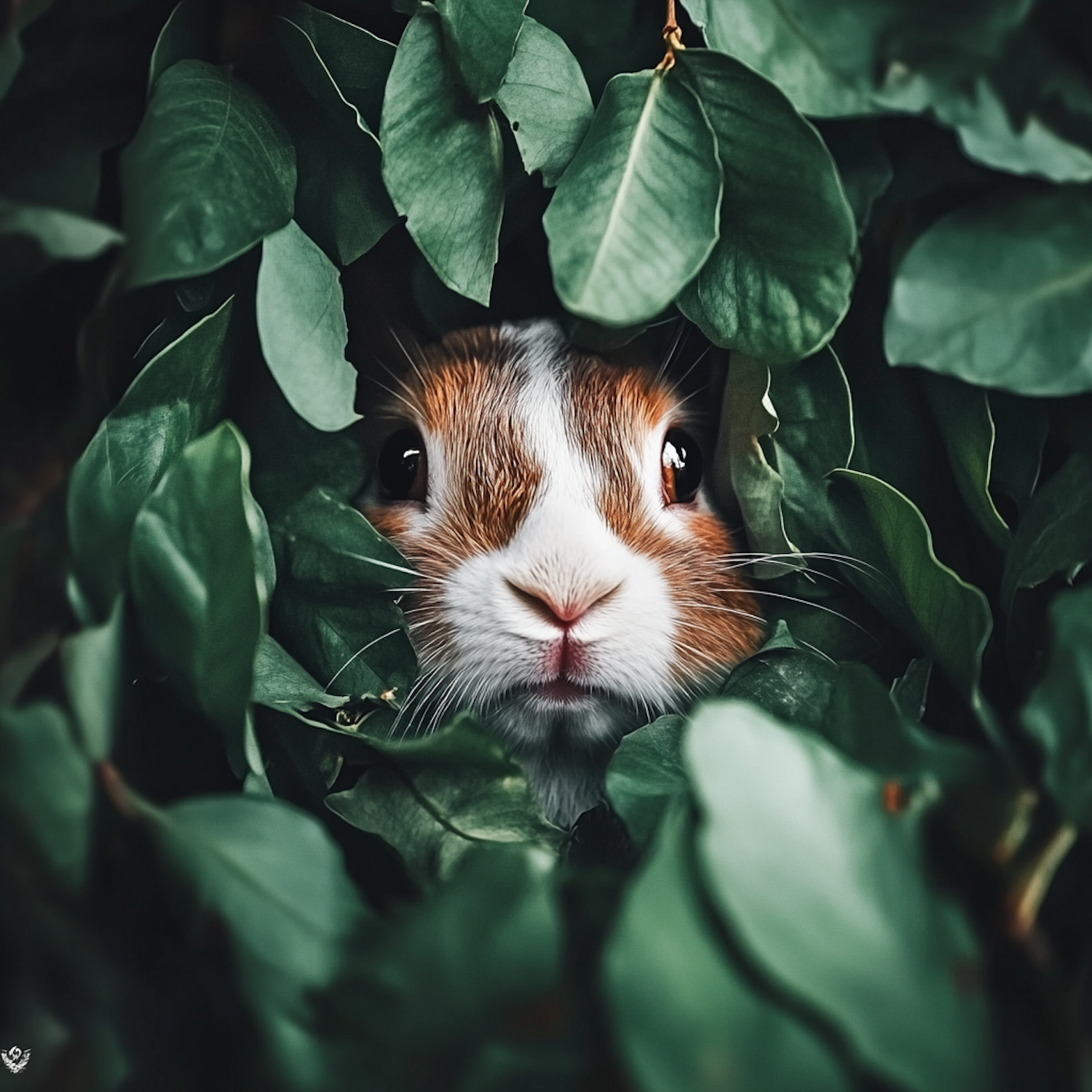 A guinea pig peeks through lush green leaves, its brown and white face framed by vibrant foliage, creating a cozy, natural scene.