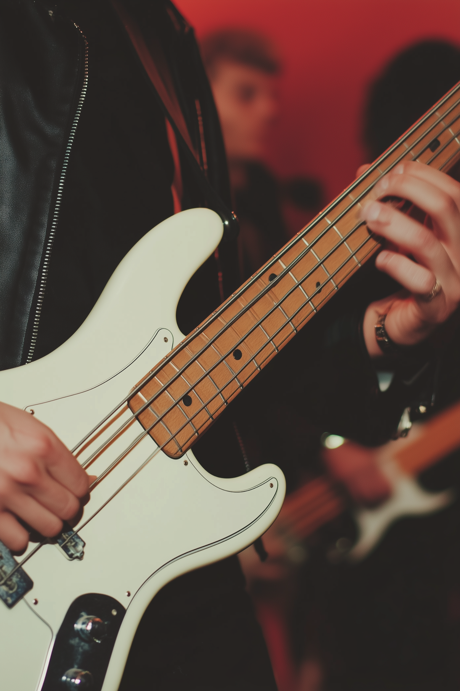 Close-up of hands playing a white electric bass guitar, with a black leather jacket and warm red background lighting.