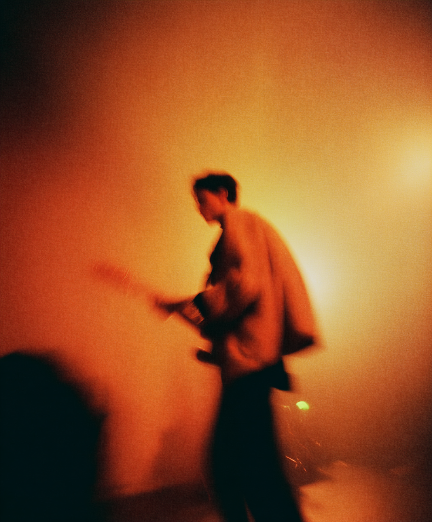 Blurred silhouette of a guitarist in warm orange lighting, creating a moody and dynamic atmosphere. Perfect for music or art themes.