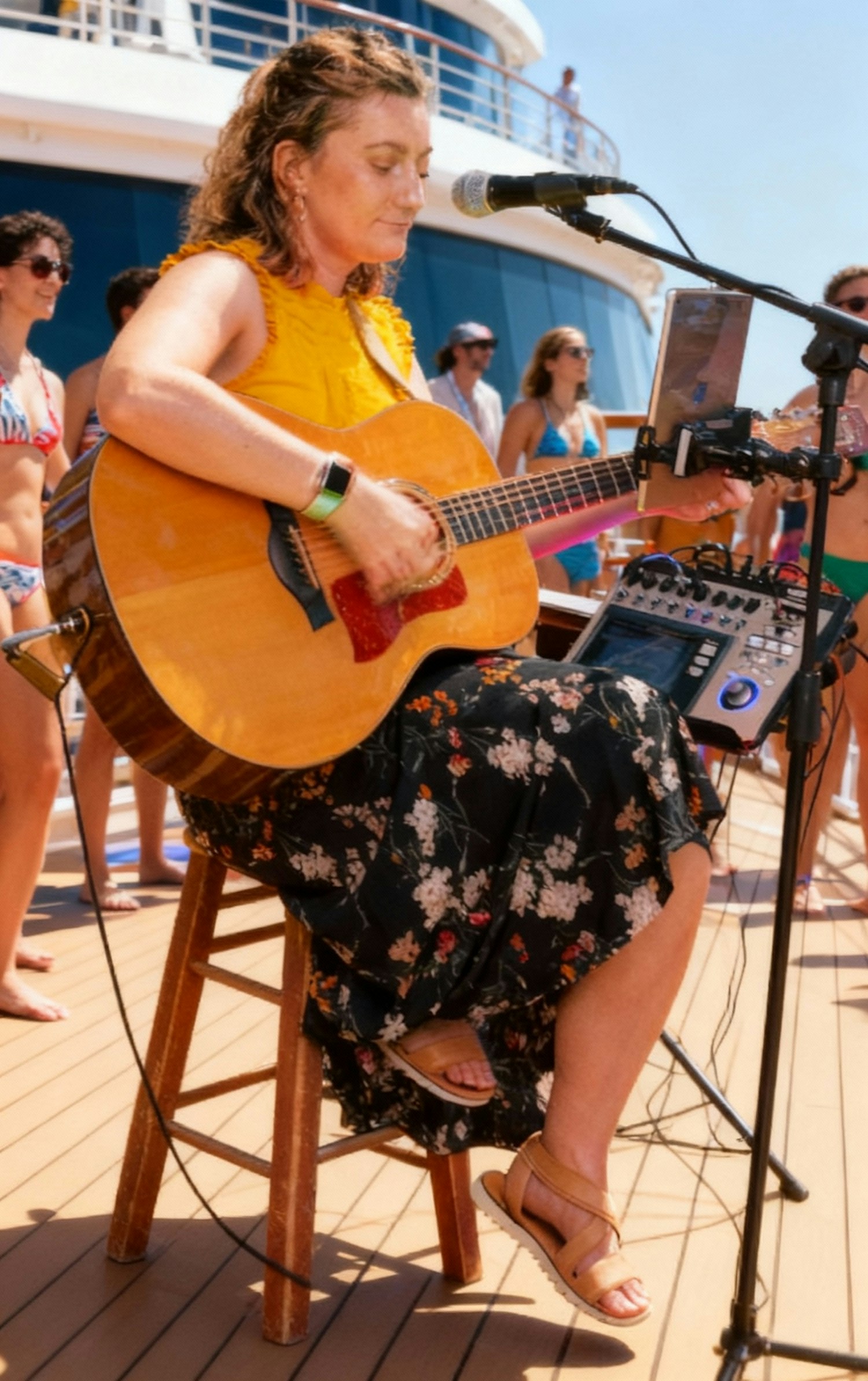 A woman performs on a cruise ship deck, playing guitar and singing, surrounded by a relaxed crowd enjoying the sunny day.