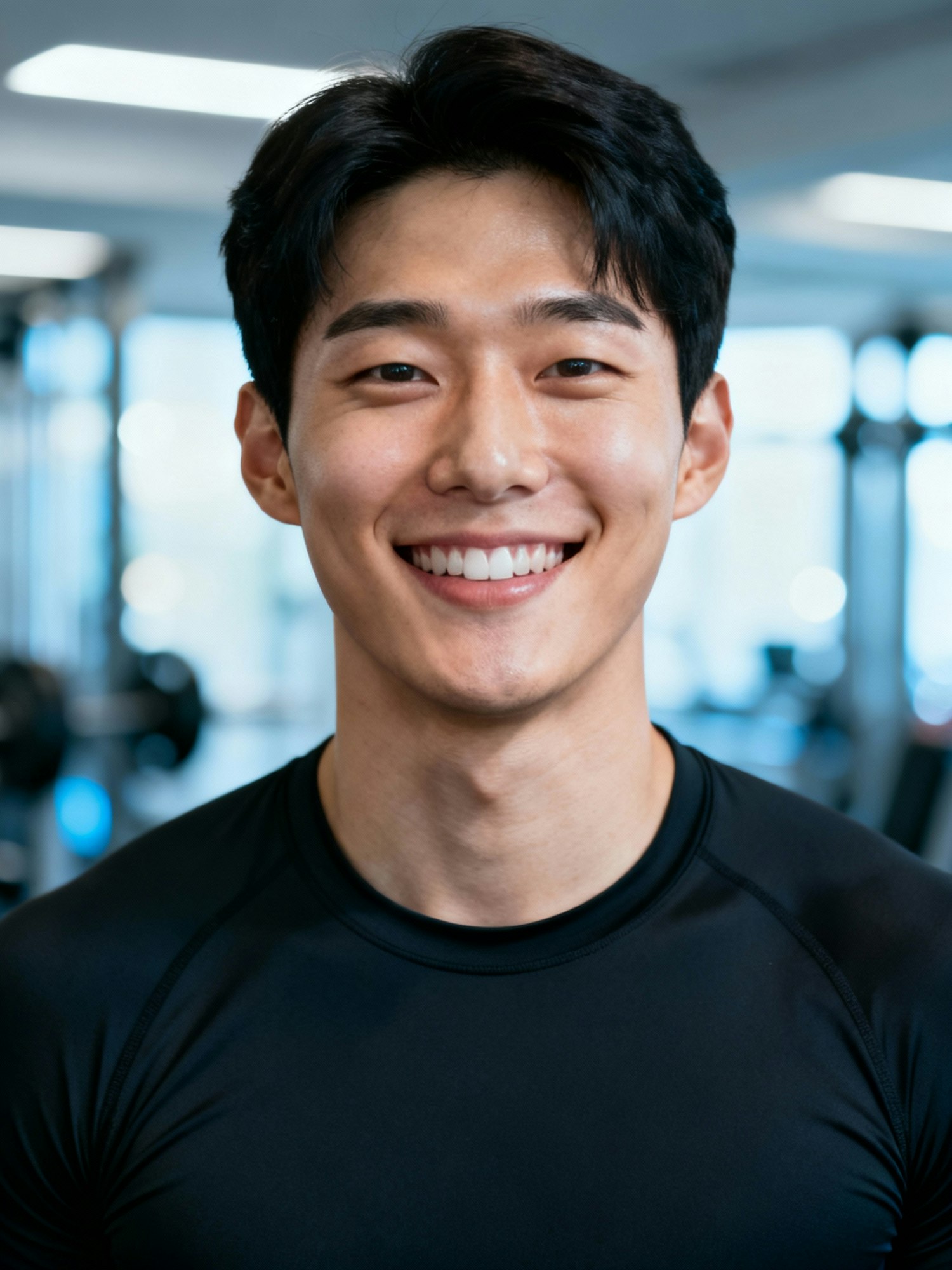 Studio headshot of a korean man HIIT coach, age 28; light skin (neutral). Defocused gym interior (soft bokeh); clamshell soft key + gentle rim; crisp white studio light; 105 mm macro-sharp detail. Framing: tight head-and-shoulders. Wardrobe: no logo black compression top. Expression: bright, energetic smile. Skin: even tone, lightly smoothed. Negative as above. Color-match: Cool daylight white balance (~6700K); subtle blue-gray cast in highlights; low vibrance, clean whites; medium-low contrast with gently lifted shadows; skin tone neutral-cool (no orange cast); key light slightly cool (⅛ CTB), no tungsten spill; background bright, desaturated gym bokeh. Negative: warm/amber tint, orange/teal grade, heavy saturation, yellow skin, tungsten glow.