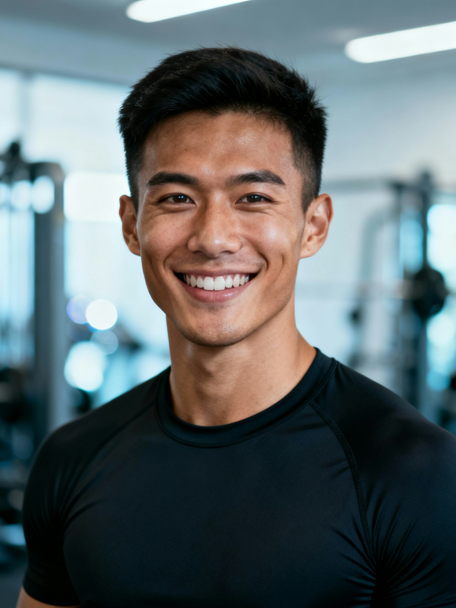 A smiling young man in a gym setting, wearing a black athletic shirt, with exercise equipment in the background.