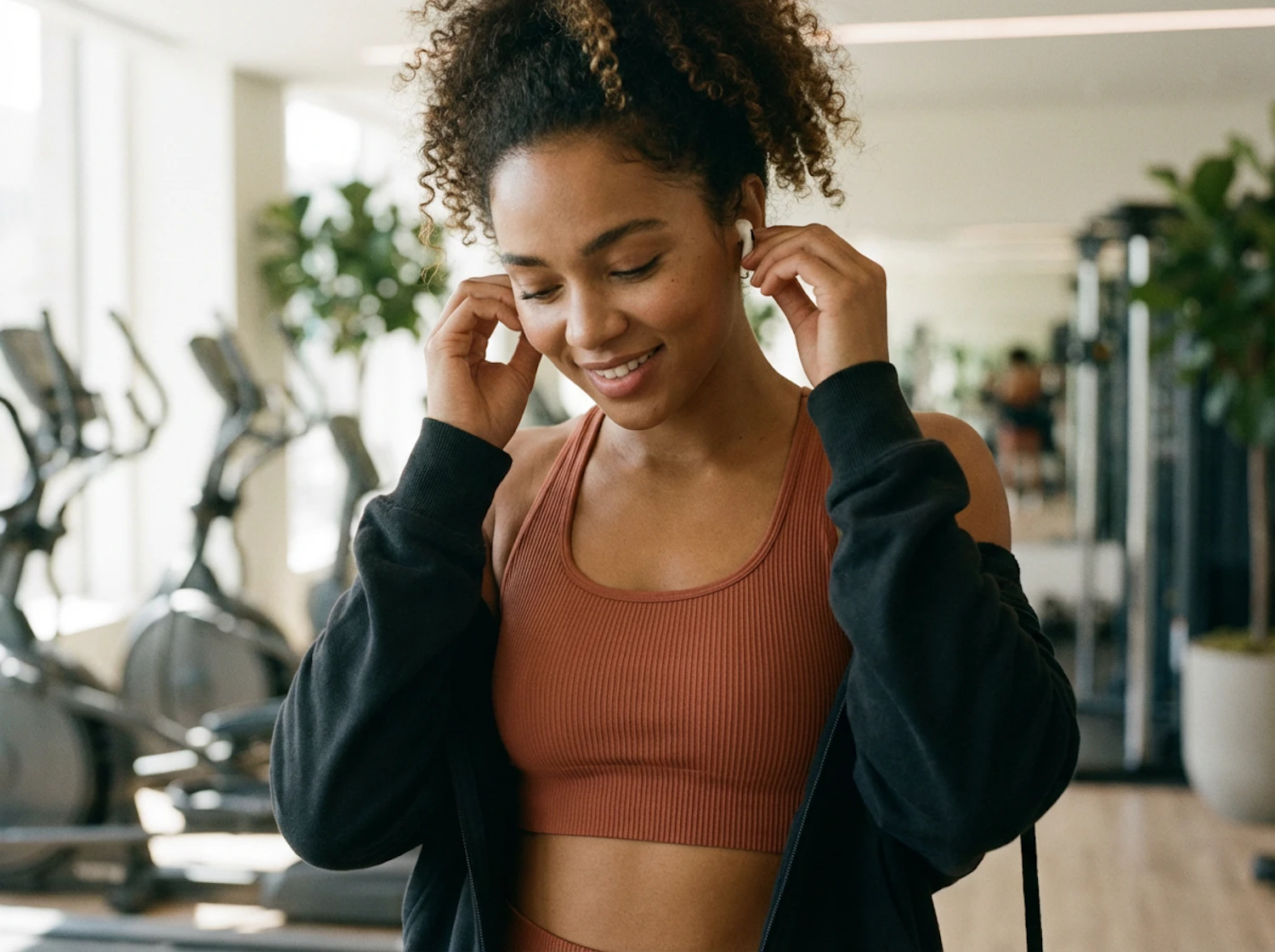 A woman in a gym adjusts her earbuds, wearing a rust-colored sports bra and black jacket, with gym equipment visible in the background.