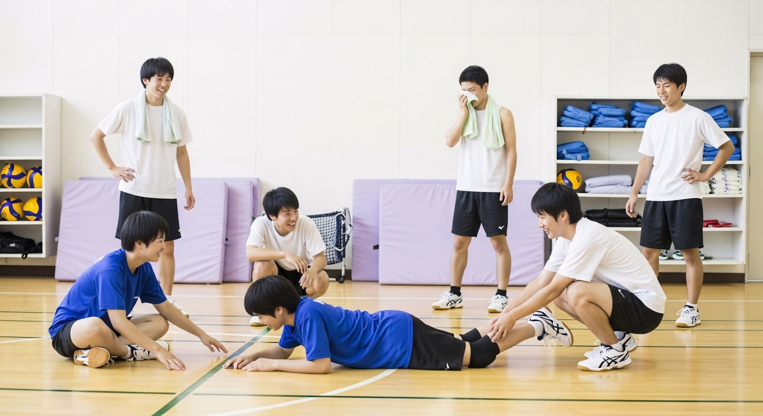 A group of young people in a gymnasium engaging in a team activity, with sports equipment and mats in the background.