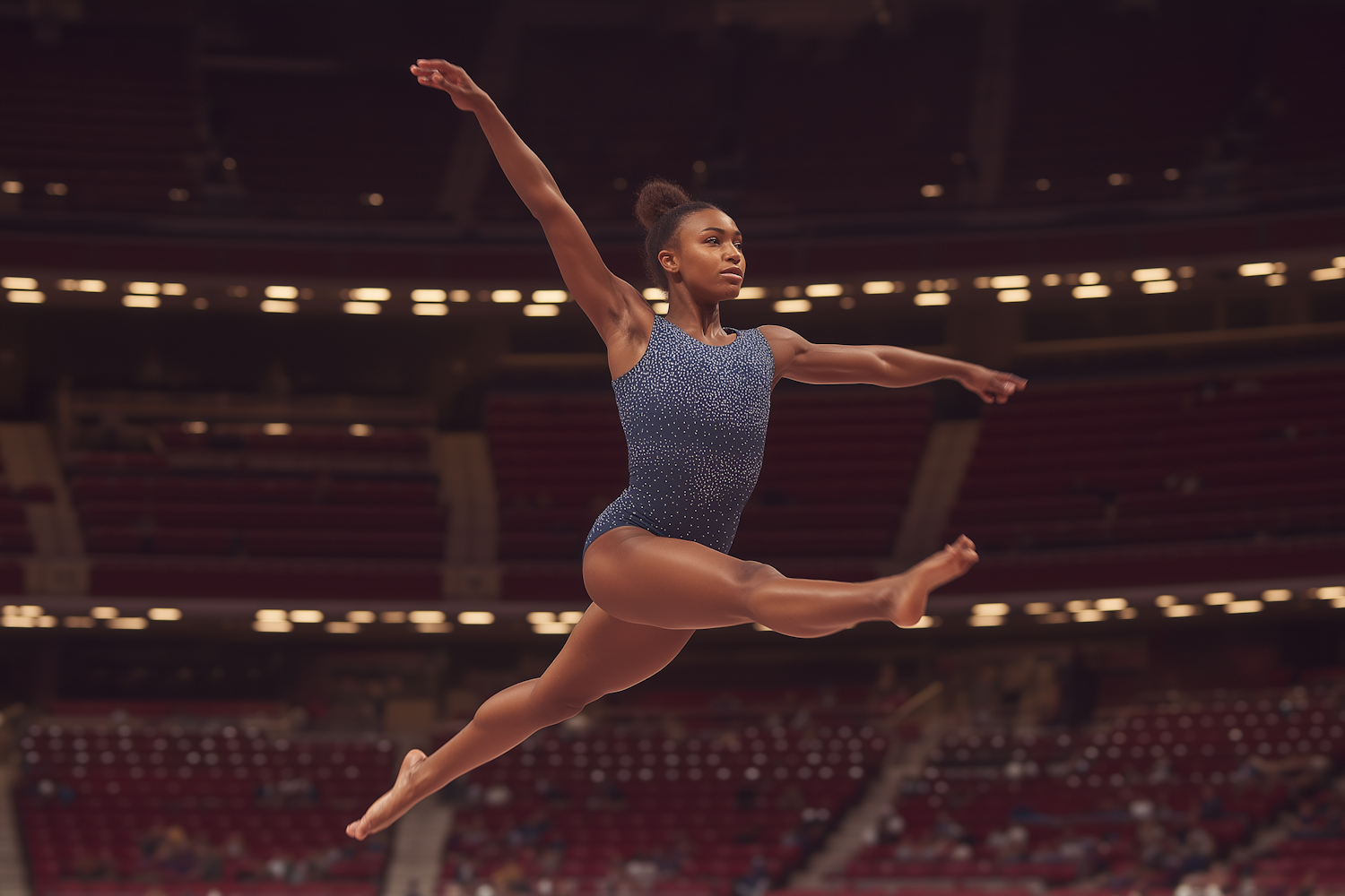 Gymnast mid-leap, sparkling leotard, focusing on form and performance against a blurry arena backdrop.
