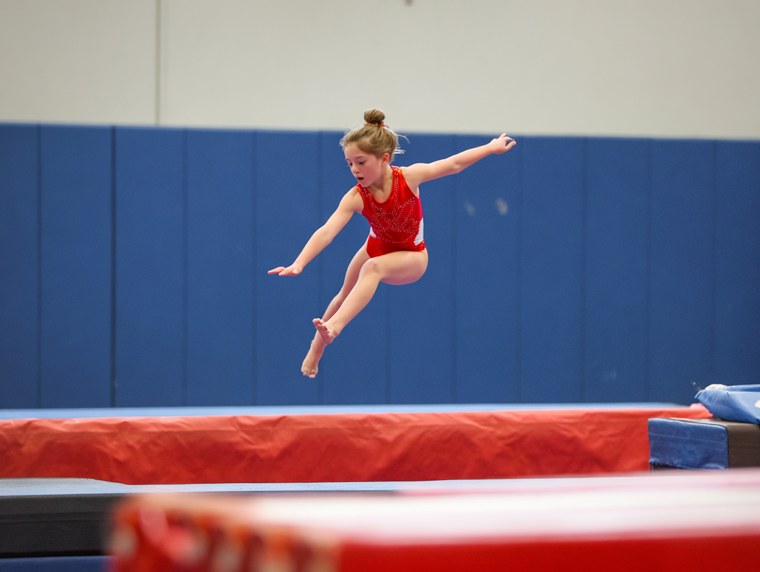 A young gymnast in a red leotard gracefully performs a leap during practice in a well-equipped gymnastics facility.