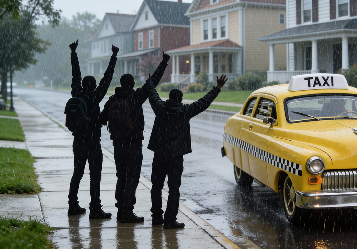 Three people hail a yellow taxi on a rainy suburban street, their silhouettes contrasting with the vibrant car and reflective wet pavement.
