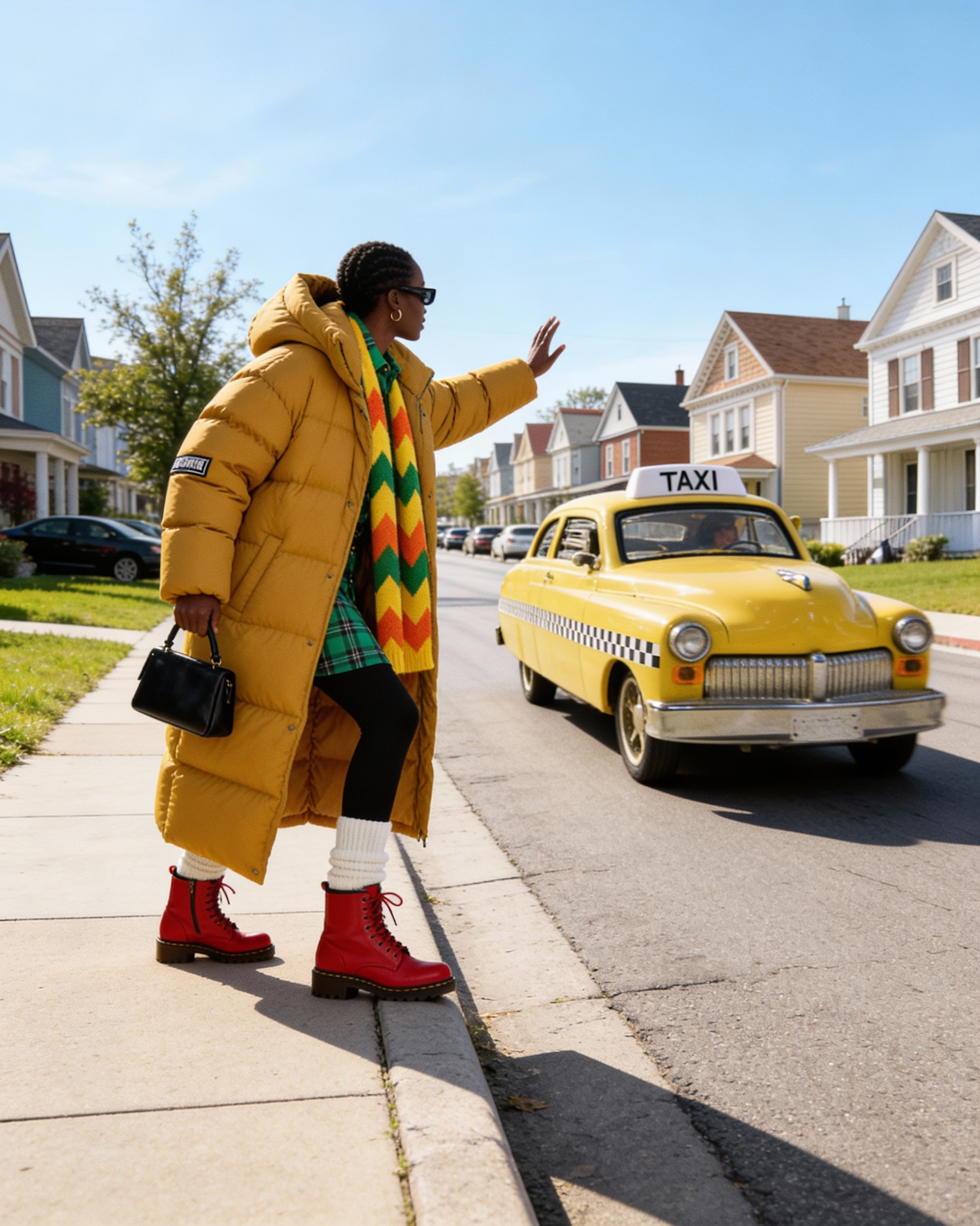 A person in a yellow coat and red boots hails a vintage yellow taxi in a sunny suburban neighborhood.