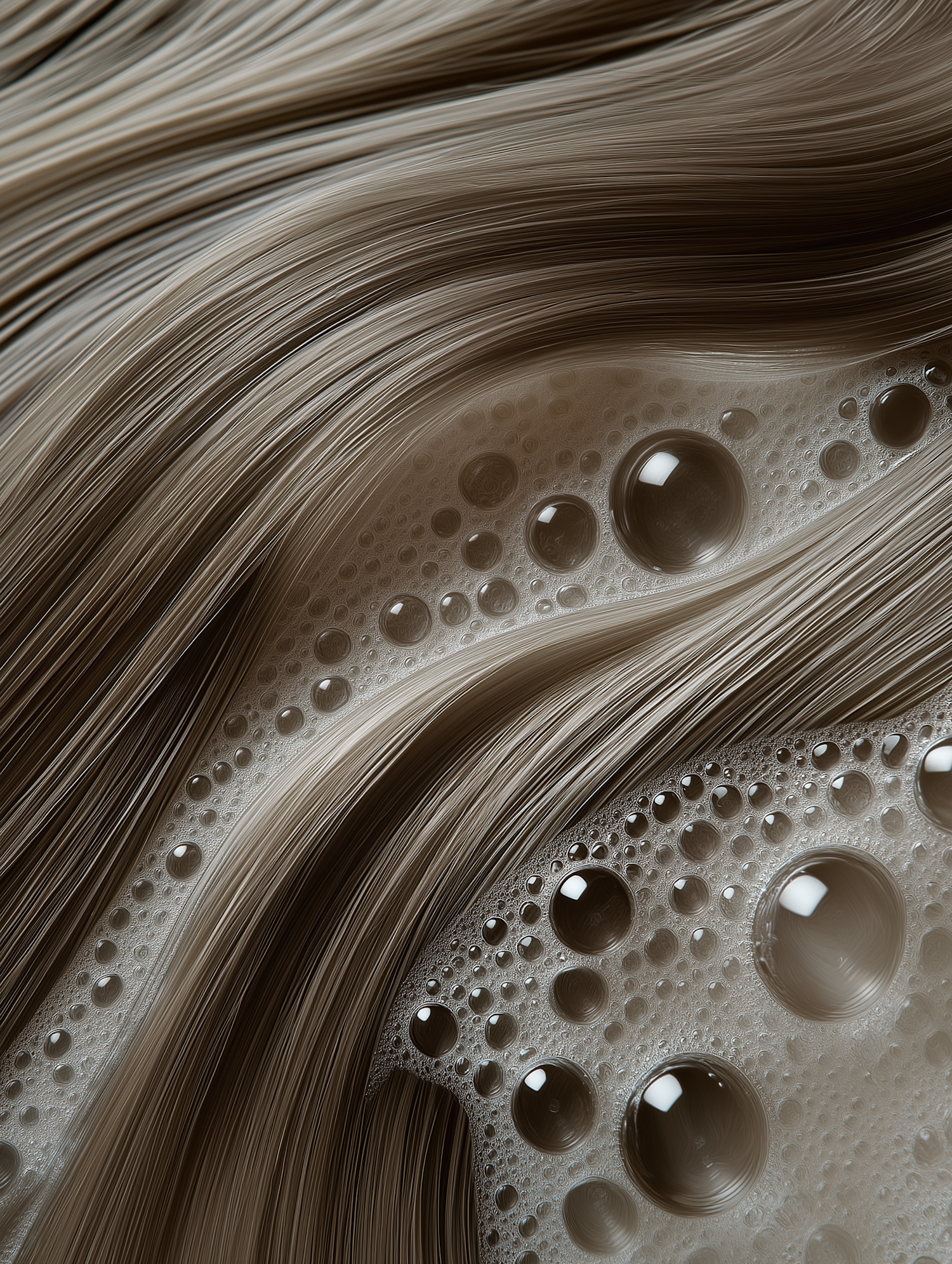 Close-up of shiny blonde hair with soap bubbles, showcasing smooth strands and a clean, glossy texture. Perfect for hair care visuals.
