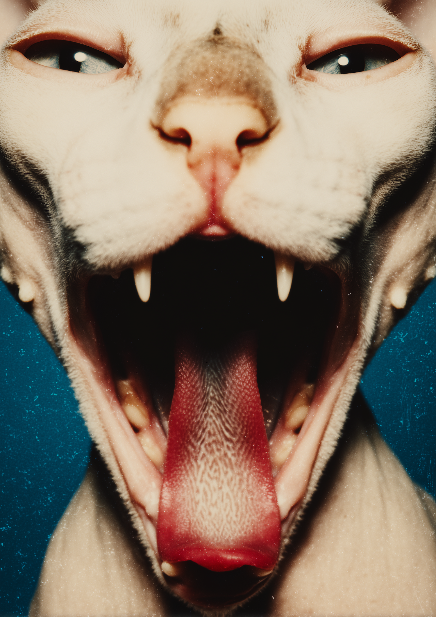 Close-up of a hairless cat yawning, showcasing sharp teeth, open mouth, and pink tongue vividly. Striking composition with a blue background.