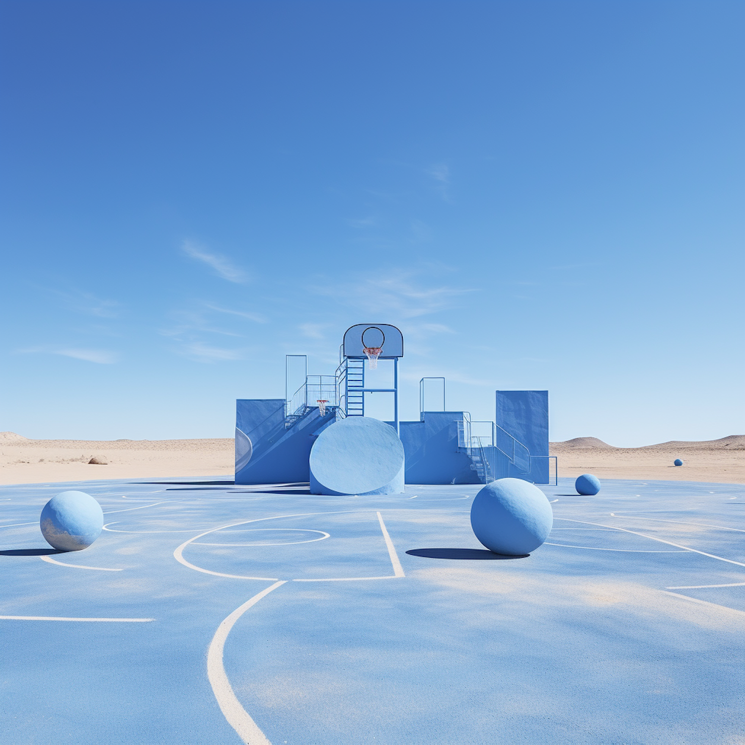 Surreal blue basketball court in a desert, featuring geometric shapes and a monochromatic theme under a clear blue sky.