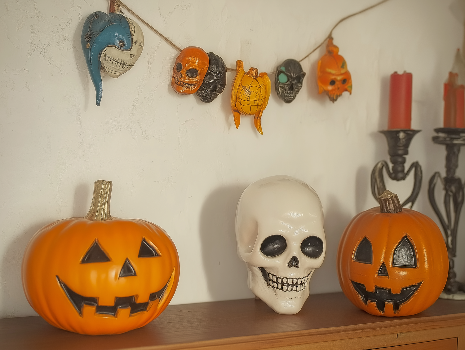 Halloween decor with jack-o'-lanterns, a skull, and spooky masks on a shelf with red candles.