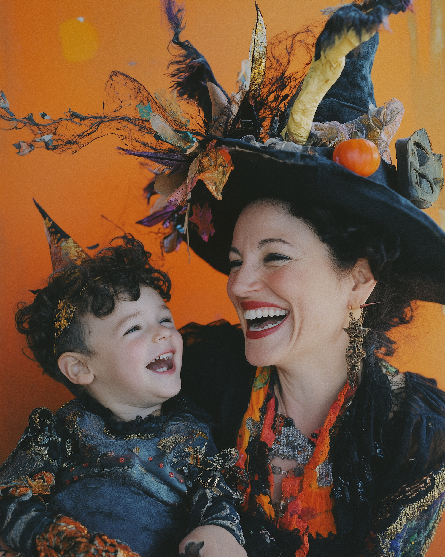 A woman and child in festive Halloween costumes share a joyful laugh against a bright orange background.
