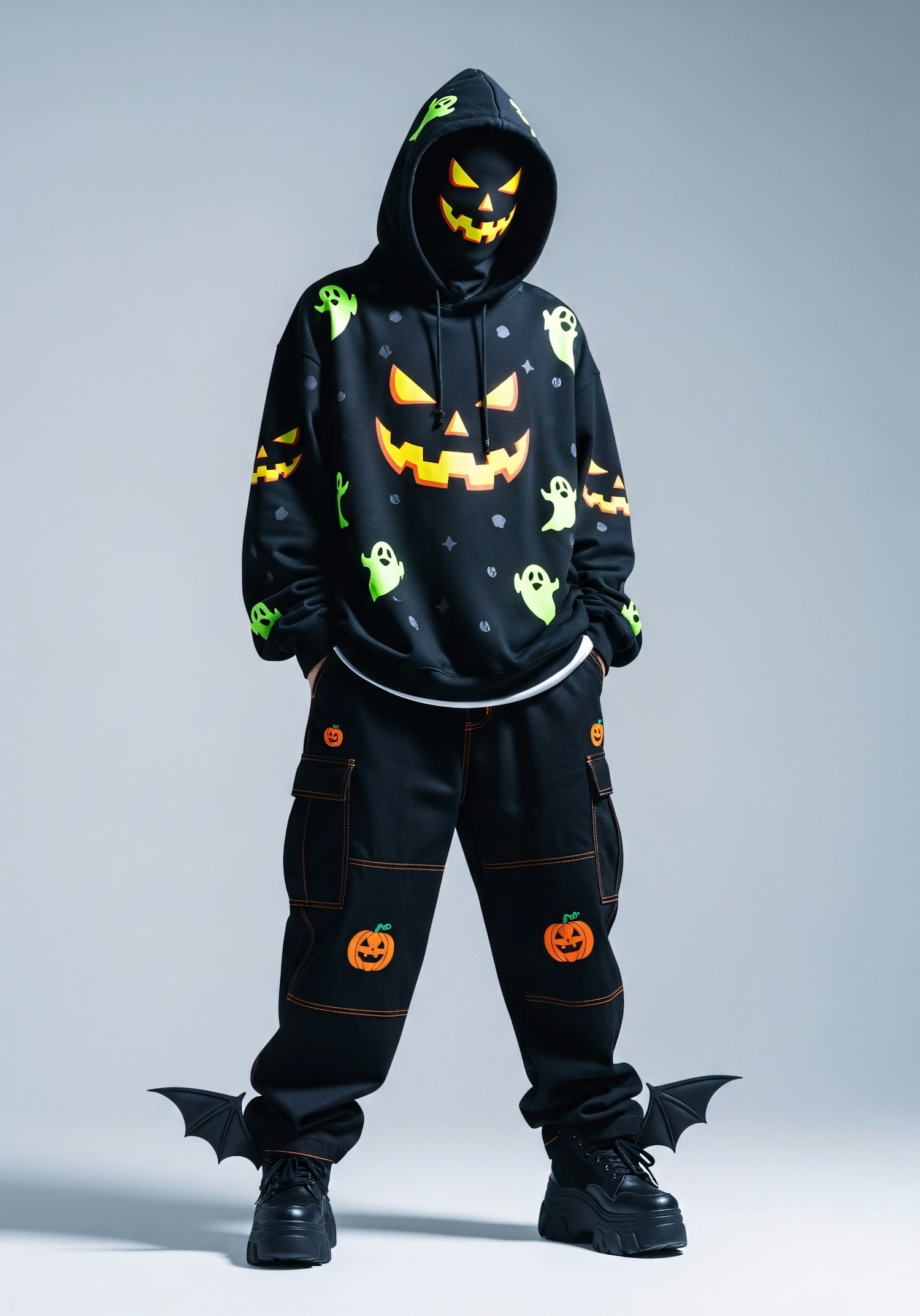 A person in a Halloween-themed outfit with pumpkin and ghost designs, paired with bat-winged shoes, standing against a neutral background.