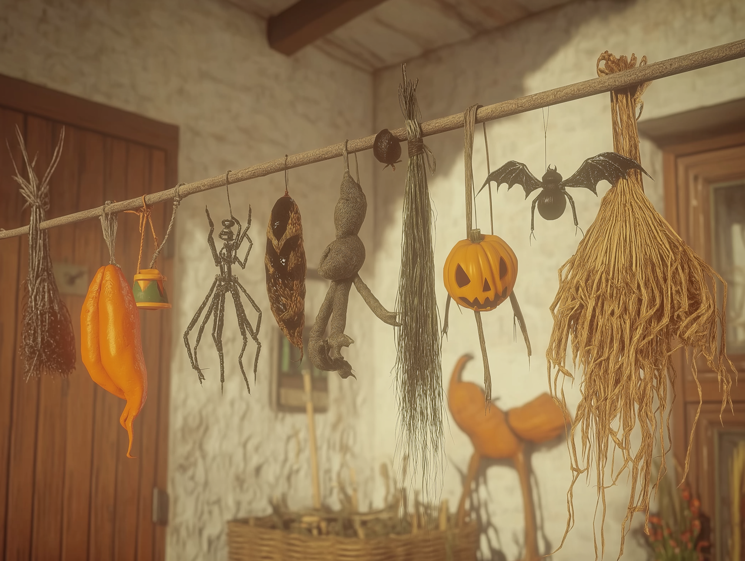 Halloween decorations hang on a rustic rod, featuring a jack-o'-lantern, bat, spider, and more against a warm, cozy backdrop.