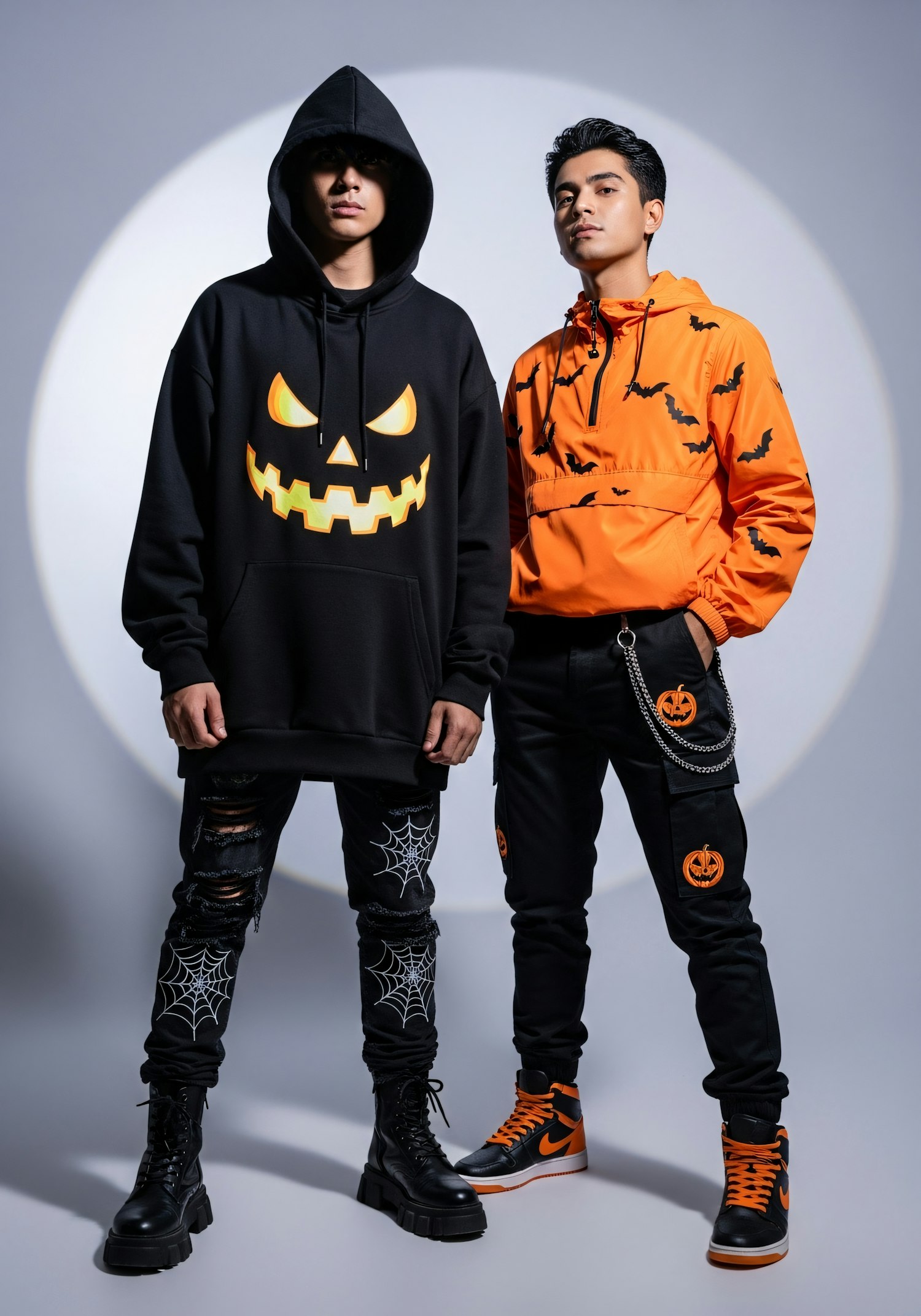 Two individuals in Halloween-themed outfits, featuring jack-o'-lantern and bat designs, pose confidently against a neutral background.