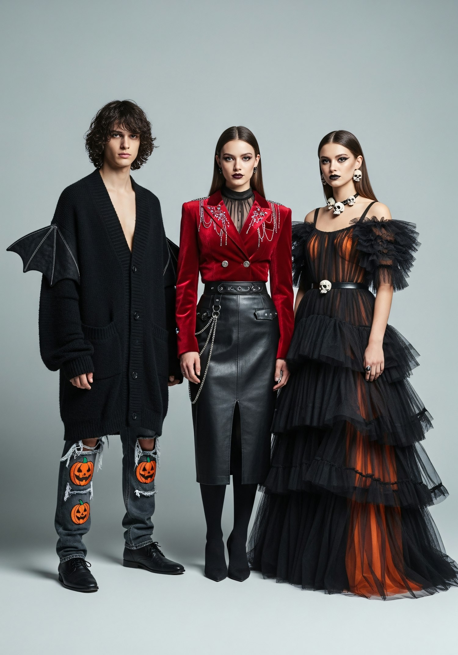 Three individuals in Halloween-inspired gothic fashion, featuring bat-wing cardigans, pumpkin jeans, velvet blazers, and tulle dresses.