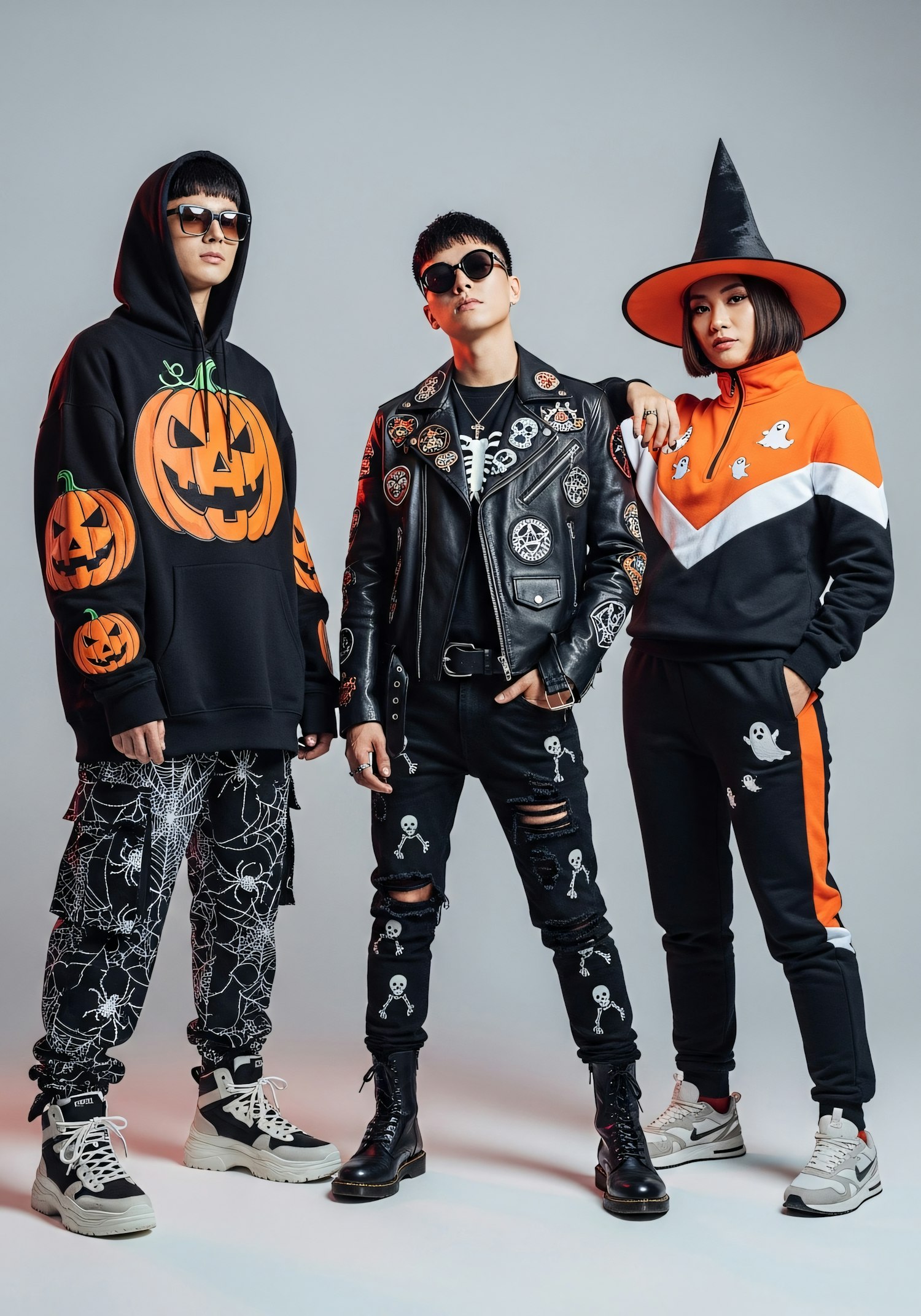 Three stylish individuals in Halloween-themed outfits, featuring jack-o'-lanterns, skeletons, and ghosts, posing confidently.