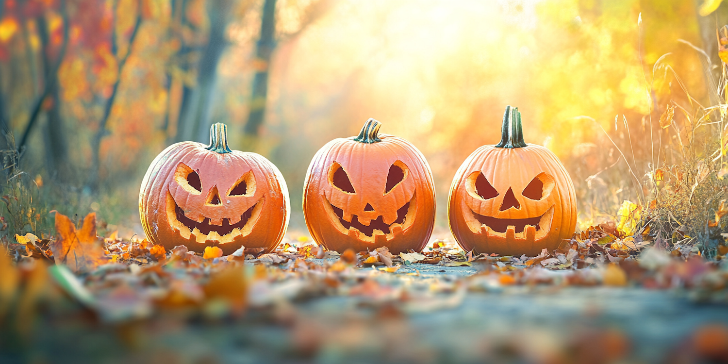 Three carved pumpkins with spooky faces on a leaf-covered path, bathed in warm autumn sunlight.