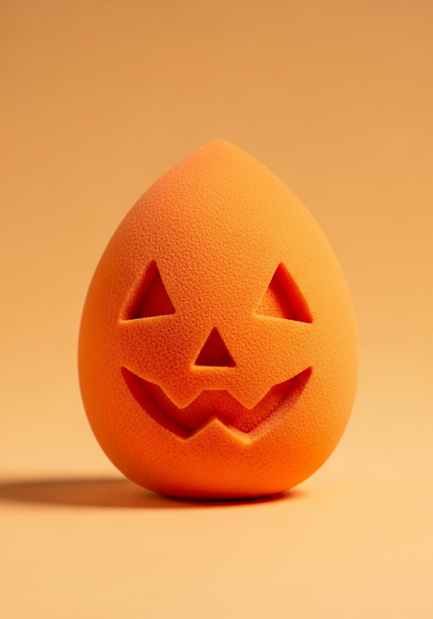 An orange makeup sponge with a jack-o'-lantern face design, set against a matching orange background for a festive Halloween vibe.