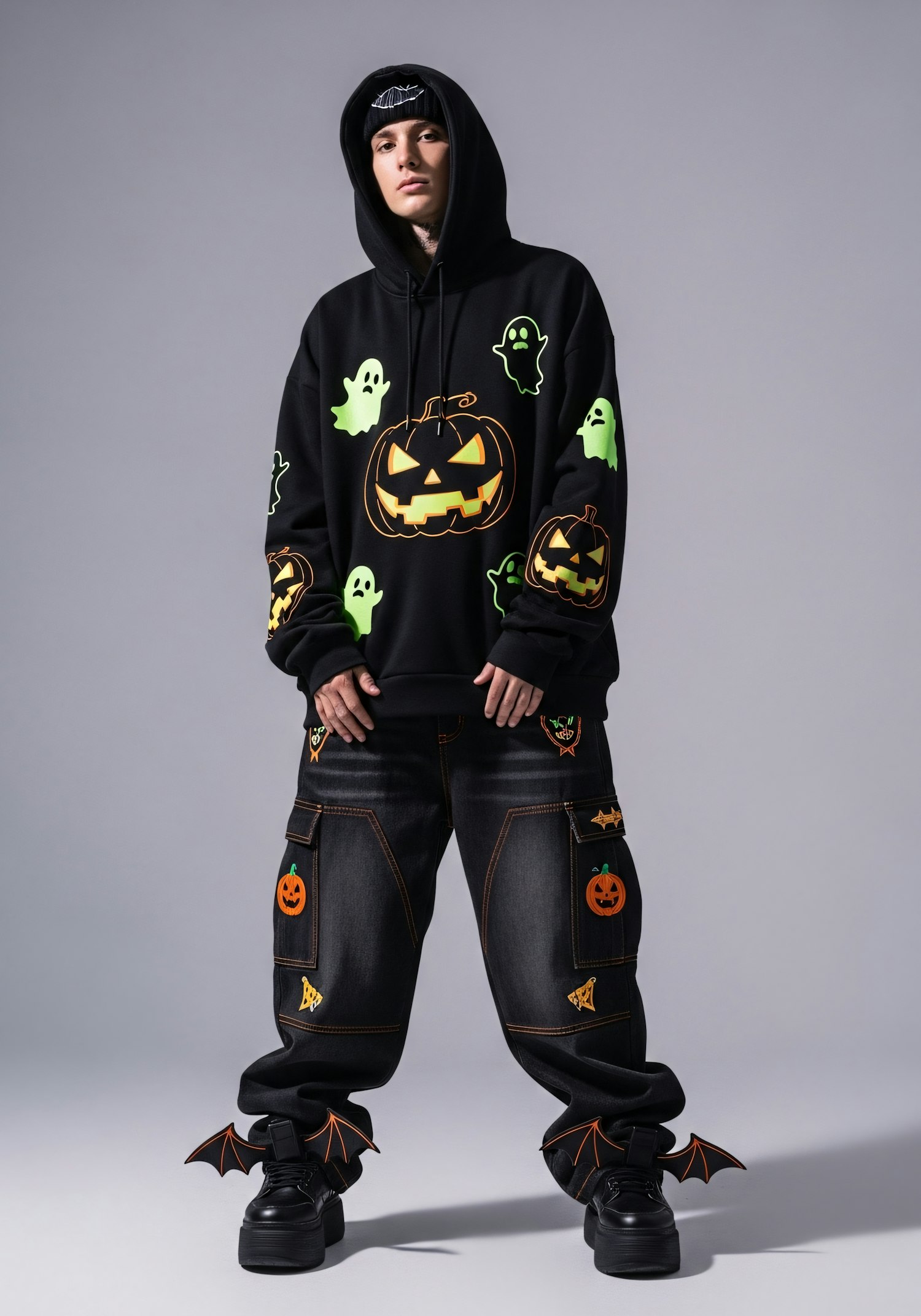 A person in a Halloween-themed outfit with ghost and pumpkin designs, dark denim pants, and bat-winged shoes against a gray background.
