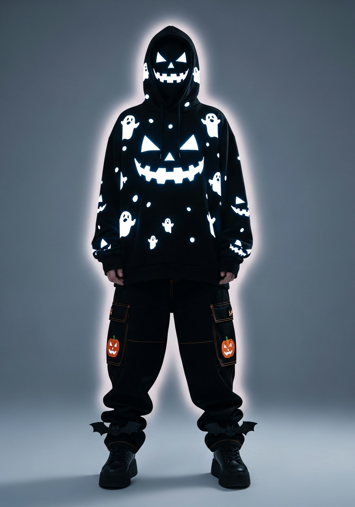 A person in a glowing Halloween-themed outfit with ghost and pumpkin designs, set against a neutral background.