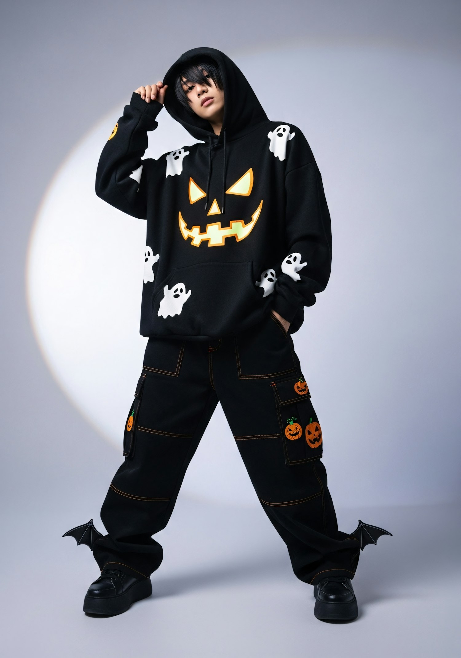 A stylish Halloween-themed outfit with a glowing jack-o'-lantern hoodie, ghost details, pumpkin-decorated pants, and bat-wing shoes.