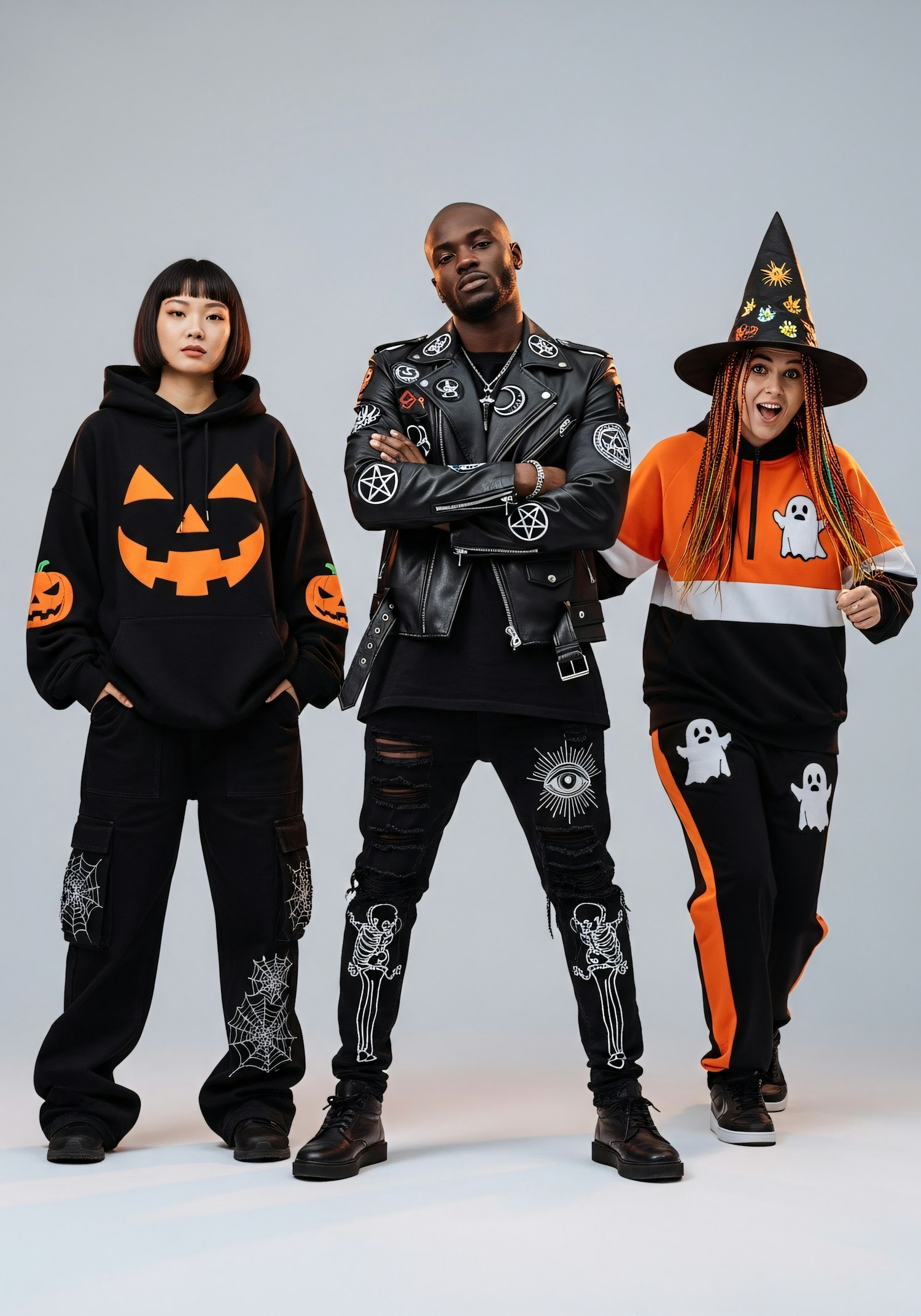 Three individuals in Halloween-themed outfits, featuring jack-o'-lanterns, skeletons, and ghosts, stand confidently against a neutral background.