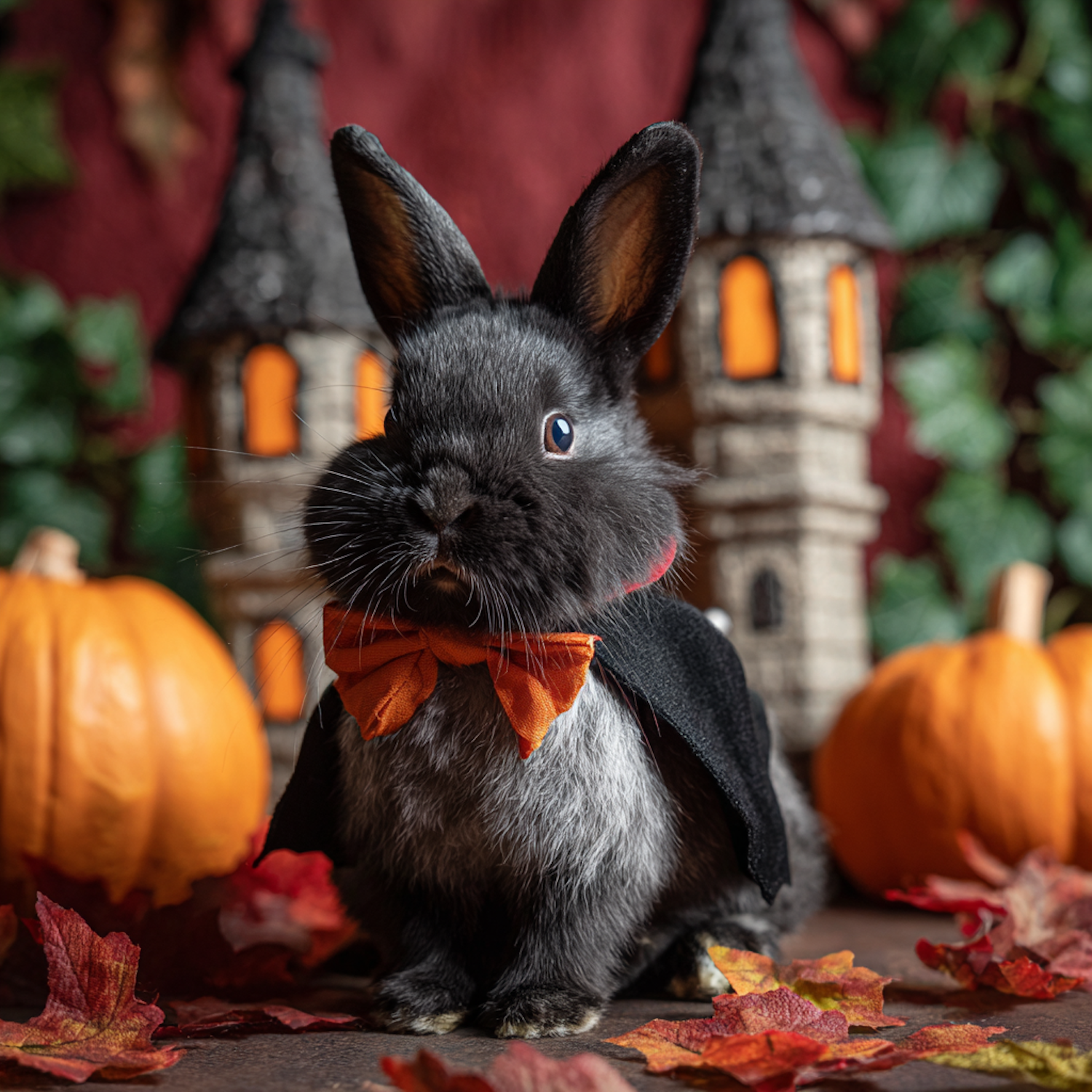 A cute black rabbit in a Halloween costume with pumpkins and a spooky castle backdrop, surrounded by autumn leaves.