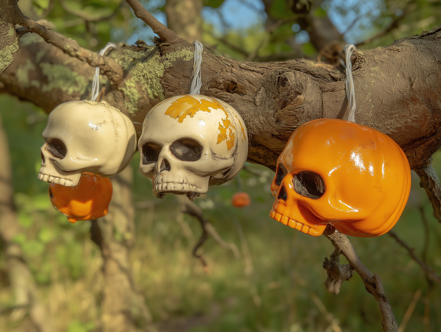 Three colorful skull decorations hang from a tree branch, creating a spooky yet vibrant Halloween scene.