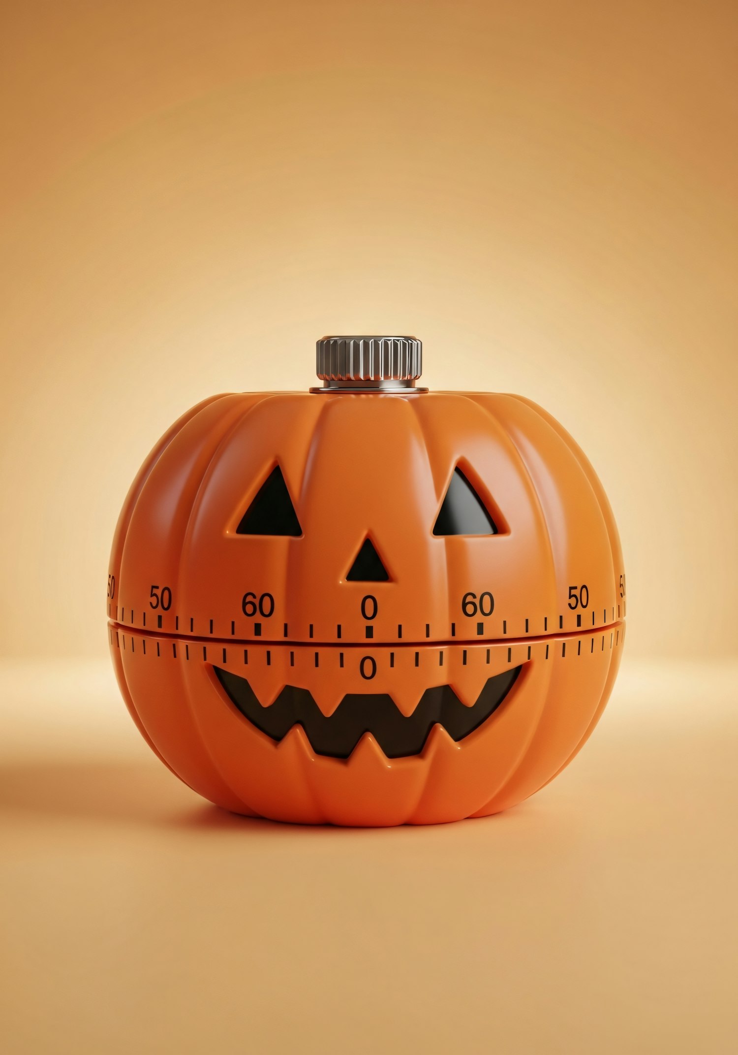 A pumpkin-shaped kitchen timer with a jack-o'-lantern design, featuring a bright orange body and a metallic knob, set against a warm background.