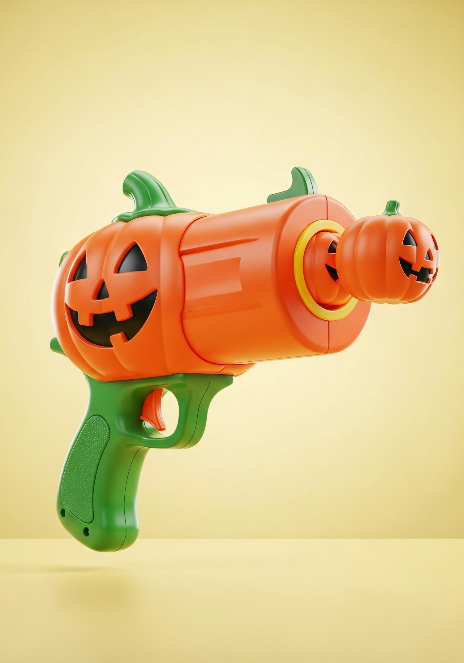 A 3D-rendered Halloween-themed toy gun shaped like a pumpkin with jack-o'-lantern faces, set against a warm yellow background.