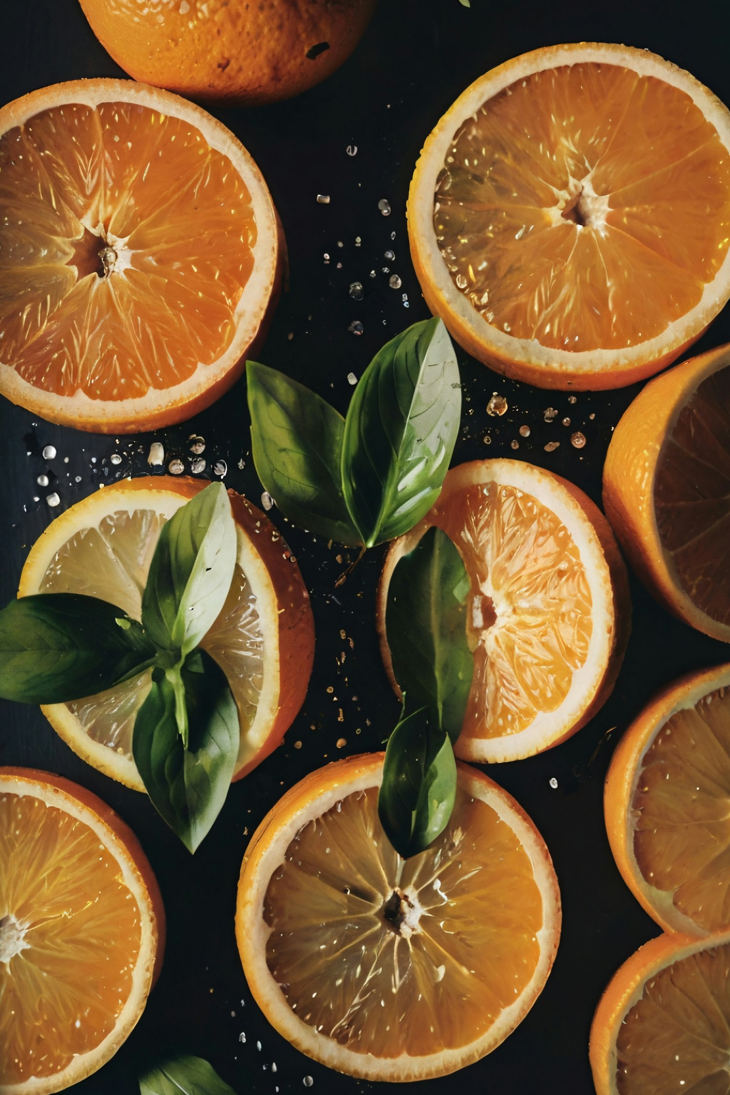 Vibrant orange slices with fresh basil leaves and salt crystals on a dark background, creating a refreshing and appetizing scene.