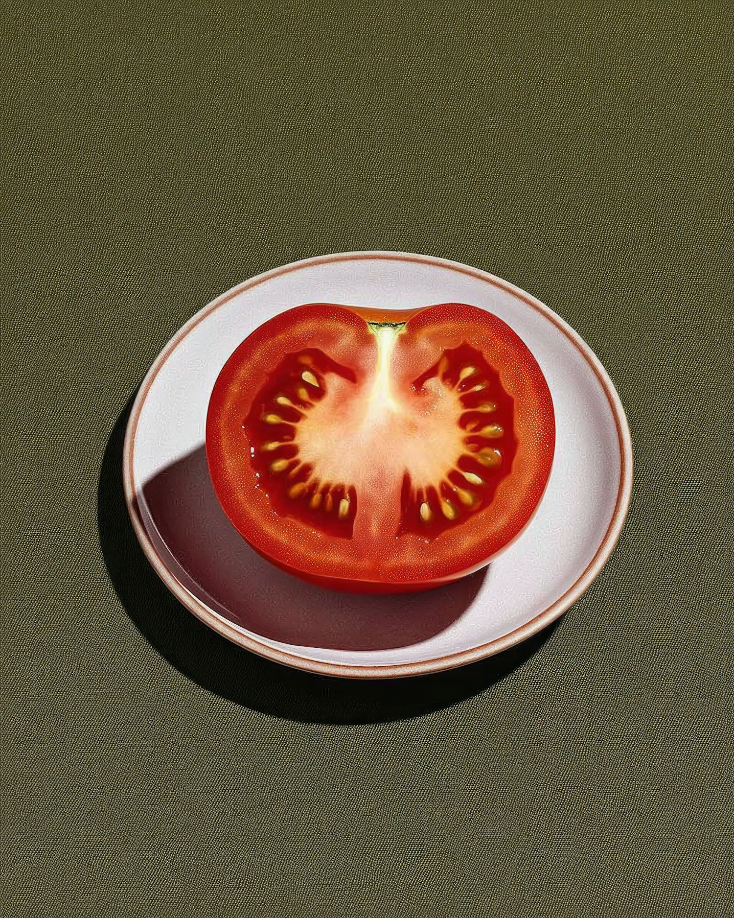 A halved tomato on a white plate against a green background, showcasing vibrant colors and a minimalist aesthetic.