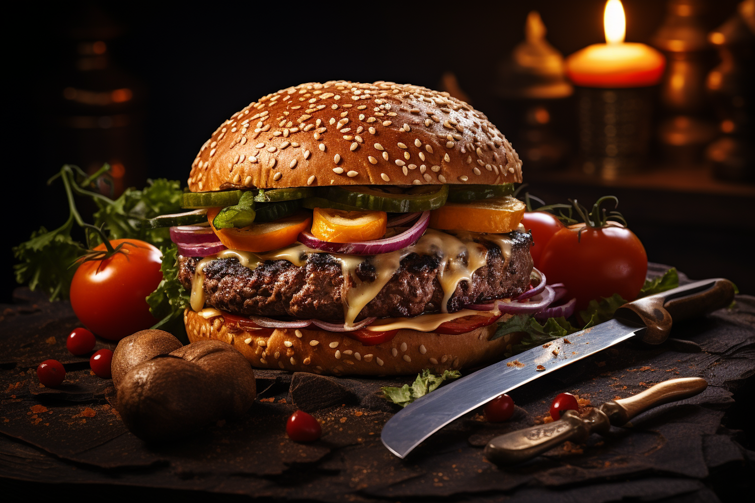 Delicious burger with cheese, onions, pickles, and tomatoes on a sesame bun, set in a warm, rustic ambiance with candlelight.