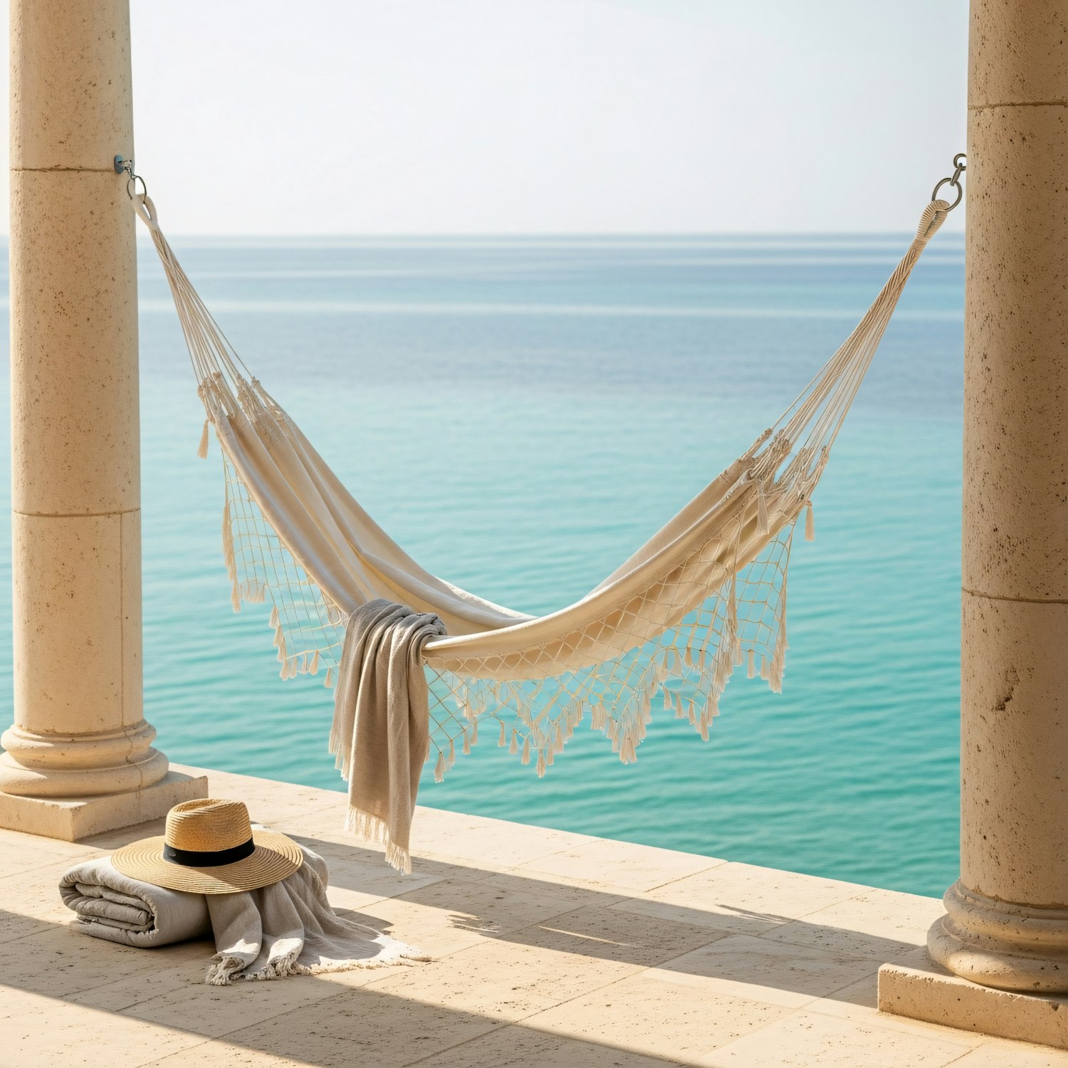 Relaxing hammock with a blanket and hat, overlooking a calm turquoise sea, perfect for a serene coastal retreat.