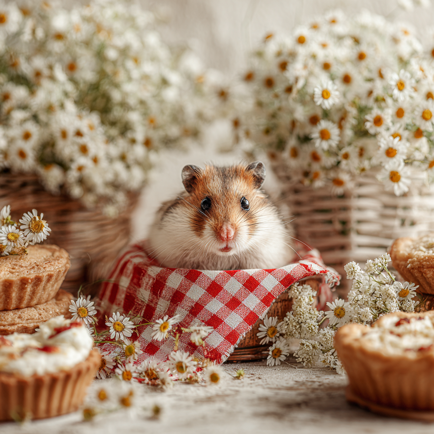 Adorable hamster in a basket surrounded by daisies and baked goods, creating a cozy and rustic atmosphere.
