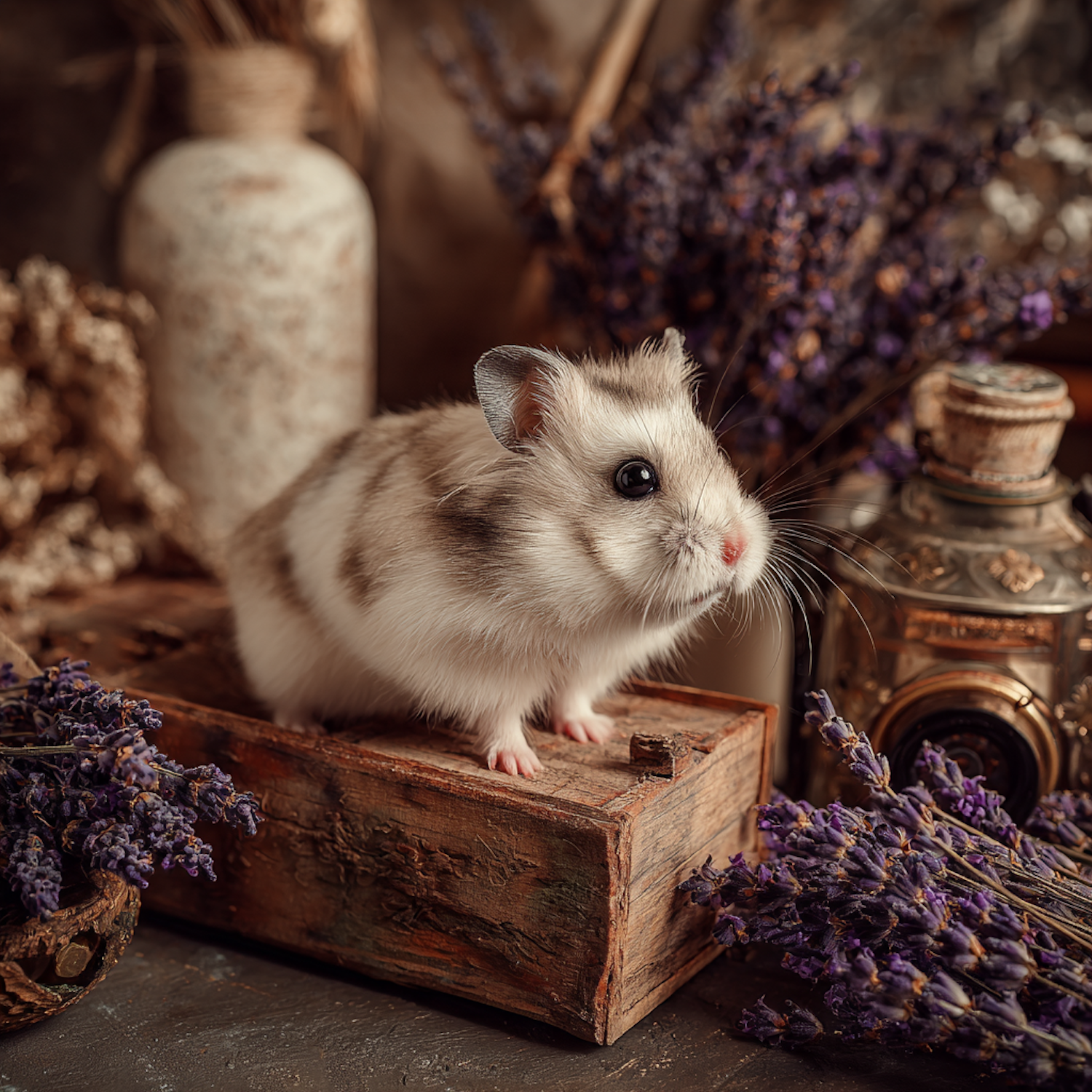 A cute hamster sits on a wooden box surrounded by dried lavender and vintage decor, creating a cozy and rustic atmosphere.